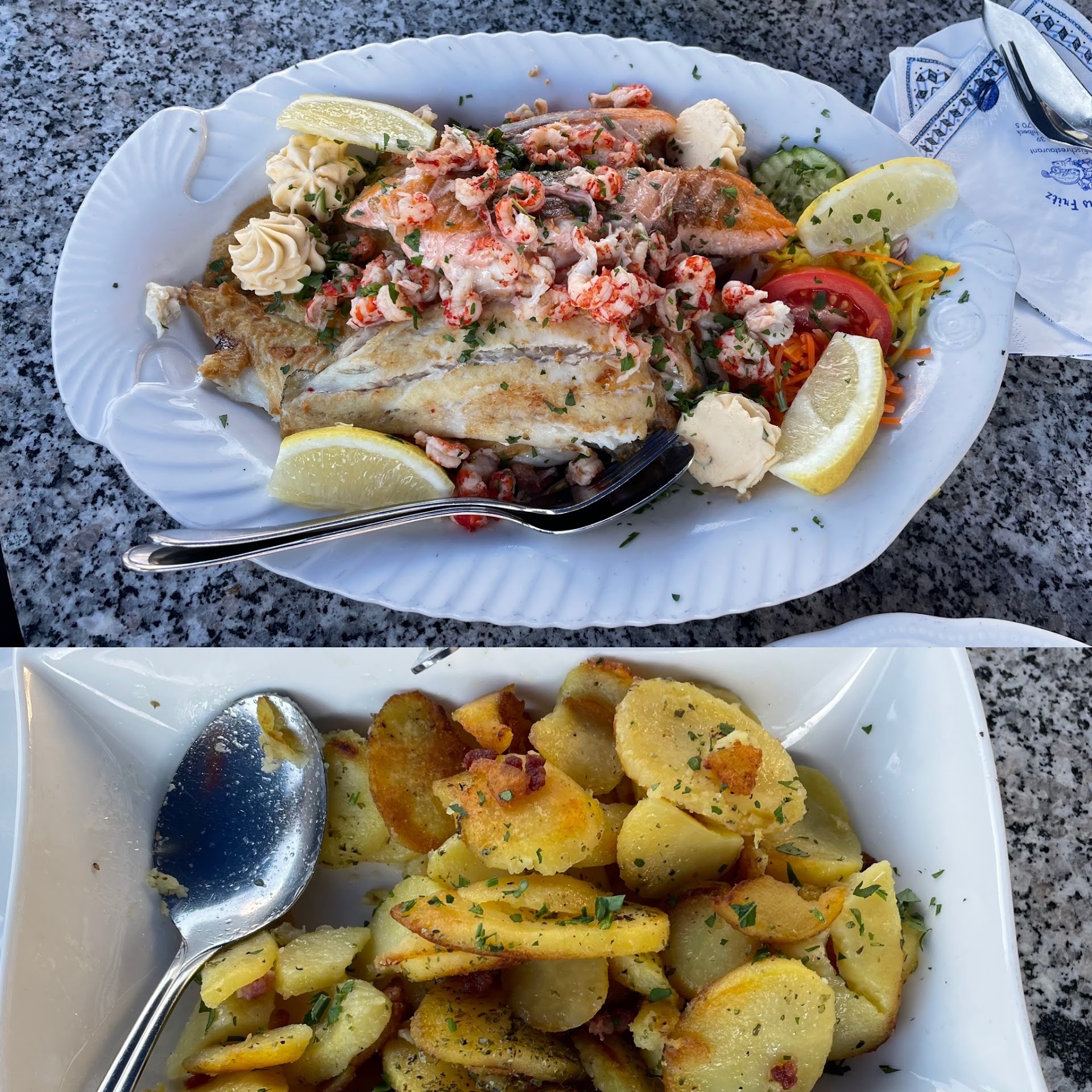 Die Fischplatte beinhaltete reichlich Fisch. Es gab Salatdekoration, etwas Bratkartoffeln, frische Remoulade und rosa Aiolisoße dazu. Geschmacklich ist die Platte sehr zu empfehlen. Wir haben den Rest der Fischplatte mit etwas Remoulade einpacken lassen und mit nach Haus gekommen (Als kleine Anmerkung erlauben wir uns zu schreiben, dass es für uns etwas mehr Bratkartoffeln sein können ;-) )