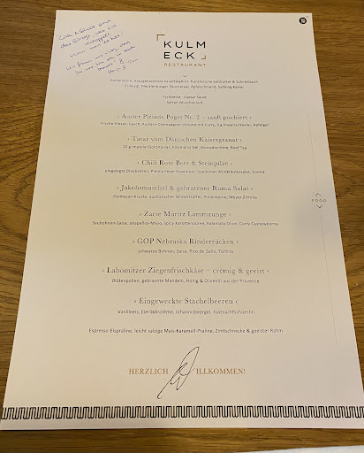 Read moreIm Juli 2023 hatte es uns an die schöne Ostsee verschlagen und wir wollten diese Gelegenheit nutzen, uns auch kulinarisch verwöhnen zu lassen. Vom Kulmeck hatten wir schon viel gehört und waren daher sehr gespannt, was uns erwarten würde. Bevor ich auf die Details zu sprechen komme, möchte ich gerne sagen, dass es rundherum ein WOW-ERLEBNIS war. Wir waren und sind noch immer überwältigt. Das Kulmeck ist sehr schön gelegen und bietet eine private, fast familiäre Atmosphäre. Dies, weil es von der Anzahl der Tische überschaubar ist und vor allen Dingen sehr stilvoll und wunderschön eingerichtet ist. Wir wurden freundlich begrüsst und durch die Menükarte geführt. Das Menü war ein Gedicht. Tom Wickboldt ist in unseren Augen ein wahrer Künstler, der es versteht, super hoch-qualitative Produkte sowohl für das Auge als auch für den Gaumen wundervoll zu gestalten, zuzubereiten und anzurichten. Jeder Teller war ein Kunstwerk und geschmacklich nicht zu übertreffen. Wir sind noch immer total geflashed und das, obwohl wir schon bei sehr vielen Sterneköchen zu Gast waren - das Kulmeck war ein absolutes Highlight. Hervorheben möchten wir auch, dass der Service erstklassig war. Wirklich ein erstklassiges Restaurant und ein weltklasse Koch! Der einzige Wermutstropfen ist, dass die Ostsee so weit weg ist. Aber wir werden 100%ig...