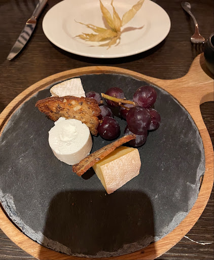 Nachspeise Zum Schluss eine Käsevariation, die Variation war ein Witz, habe den Käse fast übersehen … 3 kleine Würfelchen wurden neben Weintrauben serviert.