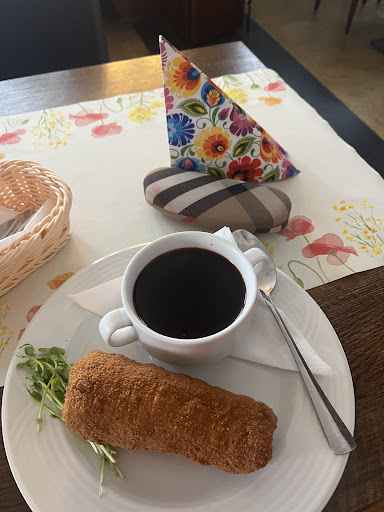 Ogromne rozczarowanie. Wystrój w porządku jeśli ktoś lubi styl z kwiatkami i kolorami. Pierwszy minus wjechał za brudny obrus ale to można było przemilczeć. Zamówiliśmy barszcz czerwony z krokietem i już przy krokiecie z mięsem można było stwierdzić, że coś z tym mięsem jest nie w porządku. Barszcz bardzo średni. Ale kartacze i pierogi to jakiś dramat. Zarówno pierogi jak i kartacze miały w środku nieświeże mięso. Co było bardzo czuć. Kiedy kelnerka zabrała od Nas niemalże pełne talerze to podeszła do Nas Pani, która chyba jest właścicielką i zapytała czy wszystko w porządku. Więc uświadomiliśmy ją grzecznie, że nie. Niestety Pani nie przyjęła krytyki i stwierdziła że wszystko jest w porządku i nigdy nie mieli zwrotu. No cóż, po opiniach gości można stwierdzić że chyba jednak nie każdy był zadowolony. Nie usłyszeliśmy żadnego przepraszam albo czegokolwiek żeby załagodzić sytuację. Wyszliśmy zniesmaczeni i głodni. Rachunek wyniósł 80 EUR za jedzenie, którego nie zjadaliśmy. Koleżanka która była z nami zjadła swoje pierogi ruskie ale nie do końca, również nie do końca zadowolona. Także nie polecam. Duże rozczarowanie i ogromny niesmak, nie tylko z powodu jedzenia... Aha, zapomniałam wcześniej napisać. Wieczór kończymy z problemami...