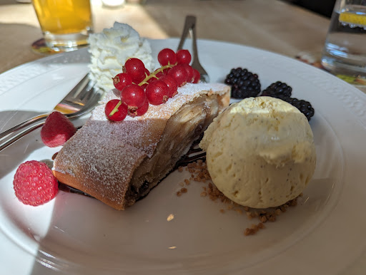 Die 2 Bestellung ließ weitere 25 Minuten auf sich warten. Apfelstrudel mit einer Kugel Eis, wobei das Eis schon angefangen hat zu schmelzen. Welche dann aber netterweise von der Dame am Empfang ausgetauscht wurde. Das Getränk kam nochmal paar Minuten später. Der Eisbecher kam erst nach 40 Minuten.....für 3 Kugeln Eis.
