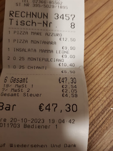 Read moreMama Leone gibt's schon ewig und es war und ist immer gemütlich und lecker. Schade war es allerdings, dass ich am ersten Weihnachtstag krank wurde. Natürlich habe ich, wie es sich gehört, den Tisch abgesagt. Das ist höhere Gewalt wenn man krank wird und dann bleibt ja nichts als abzusagen. Also rief ich um 17.35 Uhr an, entschuldigte mich, erklärte, dass ich krank geworden bin und bestellte den Tisch ab. Am anderen Ende der Leitung war ein sehr unfreundlicher Italiener, der unhöflich geschimpft hat, dass mir das erst abends einfällt. Dabei öffnete das Lokal ja erst um 17.30 Uhr. Was blieb mir also als zu warten. Der Mann redete derart ekelhaft mit mir, dass ich am Ende schon den Tränen nahe war, obwohl ich ja gar nichts falsch gemacht habe. Wenn der Umgang mit den Gästen nun grundsätzlich so läuft, kann ich nur abraten. Da nutzt dann auch das gute Essen...