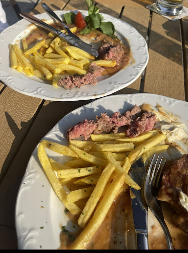 Wir sind durch Zufall auf diesem Biergarten aufmerksam geworden. Draussen hĂ€ngt eine Speisekarte und wir haben uns schon etwas ausgesucht. Im Biergarten selbst gibt allerdings eine andere Speisekarte. Wir sind dann doch schnell fĂŒndig geworden und haben Dinge, wie die SoĂe, seperat bestellt. Der Kellner war nett und freundlich. Wir wĂŒrden zĂŒgig bedient und die GetrĂ€nke kamen schnell, auch das Essen war relativ zĂŒgig am Tisch. Wir haben fĂŒr zwei GetrĂ€nke und das Essen zusammen knapp 40⏠bezahlt. Das Essen war lecker, an den Pommes fehlte uns allerdings Salz - kein Problem, lieber nach salzen, als wenn es von Anfang an zu salzig wĂ€re. Da kein Salz auf dem Tisch stand musste wir dies nachfordern. Mein Vorschlag: entweder schon Salz und Pfeffer auf dem Tisch stehen haben oder bei jedem gelieferten Essen automatisch mitbringen. Die Pommes hĂ€tten noch lĂ€nger gekonnt, aber das ist Geschmackssache. Die Schnitzel waren lecker und insgesamt alles in Ordnung. Es gibt Sonnenschirme und HolzstĂŒhle - Auflagen sind in einer Kiste, die man sich weg nehmen kann. Die Toiletten sind sauber und machen einen hygienischen Eindruck. Heute eine vier Sterne Bewertung, damit noch Luft nach oben fĂŒr das...