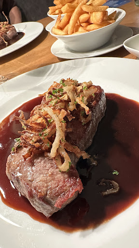 Zum Essen: Rumpsteak zart, Pommes knusprig, Zwiebeln leider verbrannt. Beilagensalat in keinster Weise im Verhältnis zum Preis. Ausschließlich ein paar Blätter grüner Salat, zwei Streifen Paprika, zwei Mini-Scheiben Radieschen.