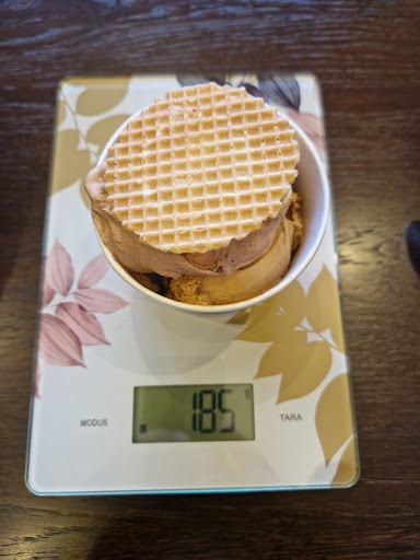 Der Rahmenrichtwert liegt bei 65 bis 90 gramm pro Kugel. Der Becher wiegt 10 gramm. Die Waffel 5 gramm. Becher mit 2 Kugeln wiegt komplett 185gramm. Becher mit 3 Kugeln wiegt komplett 206 gramm. Bilder sind als Beweis mit rezensiert.