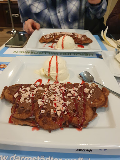 Read moreIch verstehe die Rezensionen null, es sei denn sie kommen alle aus der Verwandschaft der Betreiber. Immerhin haben sie uns dazu gebracht, diesen Ort am vorletzten Winkel von Darmstadt aufzusuchen. Als wir eintraten begrüßte uns zuerst ein sehr sehr modriger Geruch und ein sehr sehr überlasteter Mitarbeiter, der prophezeite, das es länger dauern würde. Na klar, der Laden war ja auch proppevoll mit etwa 6 Kunden. Und Mehl, Ei, Wasser zu verquirlen, in eine Waffelform zu kippen, mit süßen Gadgets aus den Behältern hinter der Theke zu verzieren, das kann schon mal ein paar Tage dauern. Erst recht, wenn die Waffeln Niedertemperatur gebacken oder Sous Vide gegart werden. Aber dazu kam es erst gar nicht, weil dieser einzige sichtbare Mitarbeiter womöglich damit beschäftigt war, die Süßigkeitengadgetbehälter zu hypnotisieren. Zur Bestellaufnahme kam es in den ersten 20 Minuten des Besuchs nicht. Weil es im Raum nicht wirklich lecker roch, zogen wir dann wieder von dannen. Ob die anderen 6 Kunden noch was bekommen haben? Wer...
