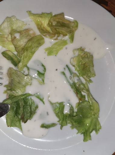 Read moreDie Vorspeise kam zeitgleich mit der Hauptspeise nach 75 Minuten. Die Bratkartoffeln waren nicht wirklich gebraten und lasch gewürzt. Der gebrachte Pfeffer war alle und die "Brat"kartoffeln dann kalt. Die rustikale Pfanne mit Dosenchampignons war fade und das Fleisch zäh.... Paprika war in der Küche ausgegangen. Die Pizza unseres Sohnes war okay für ihn. Die Damen am Nebentisch mussten nach dem Essen am Tisch um Besteck bitten. Wir waren insgesamt enttäuscht, zumal wir vor ein paar Jahren gut dort speisten. Die junge Bedienung war nett. Hier sieht man den Salat zum Essen. Lediglich das Stück Gurke und Tomate...