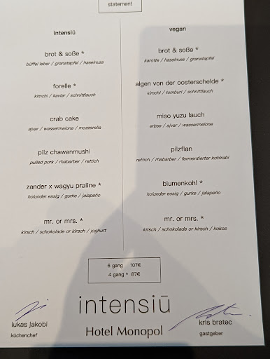 Kris Bratec als Gastgeber und sein Service begleiteten uns mit passenden Weinen entspannt und freundlich. Wir freuen uns schon auf das neue Menü, welches im intensiu circa alle 6 Wochen saisonal angepasst wird. Als Alternative gibt es auch eine vegane Variante des Menüs oder die 4 Gang Version. Wer Lust auf einen schönen Abend hat, sollte sich das „statement“ im intensiu nicht entgehen lassen!