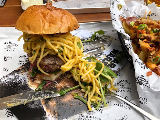 Read moreEin toller Ort für mich als Liebhaberin von Burgern und guter Qualität. Die Preise scheinen auf den ersten Blick etwas höher, aber man bekommt auf jeden Fall etwas dafür geboten. Die Burger sind liebevoll zusammengestellt, kreativ variiert und jeder Bestandteil ist super gemacht. Die Carbonara auf dem Nudel-Burger war besser als die meisten Einzel-Carbonara-Gerichte, die ich bisher im Restaurant gegessen hab. Und die BBQ-Sauce hat sogar mich als Anti-BBQ überzeugt. Absolut rund und lecker. Die Patties hätten für mich etwas weniger gewürzt sein können, da alles drumherum ja gut gewürzt war. Das Fleisch war aber perfekt "raw" gebraten und super zart. Alle Beilagen waren ebenso liebevoll gemacht und auch die Beratung zu den Getränken war klasse. Kleiner Tipp: Scharf heißt hier...