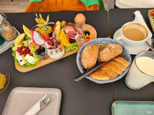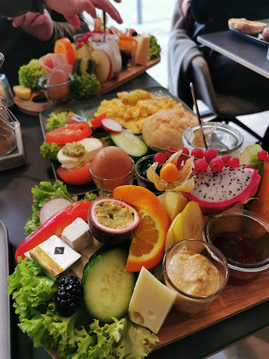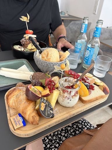 Die Frühstücksplatte sieht umwerfend aus. Sehr vielfältig. Alles mögliche an exotischem Obst vorzufinden. Feige, Maracuja, Ananas, melone, physalis, himbeere, brombeere, heidelbeere, apfel, birne, nektarine, banane, aprikose sogar, weintraube? Johanissbeeren. Aber das ist es halt auch: viel obst. Das auge isst mit - wird da großgeschrieben. Müsli war lecker. Hummus? Das war kein hummus - sorry. Oliven schmeckten gar nicht. Da kann man doch sicher eine andere qualität anbieten. Marmelade viel zu süss und billig (merkt man). Käse- und wurstaufschnitt war okay. Man kriegt auch nur einen brotkorb für 2 personen, obwohl jeder eine eigene Platte hat. Viel zu wenig. Wem sollen denn 2 Brötchen für 2 Personen und bei der fülle an Aufschnitt reichen. Das ei war frisch gekocht. Super. Butter haben sie vergessen auf die Platte zu packen. Aber der kaffee schmeckte wenigstens gut.