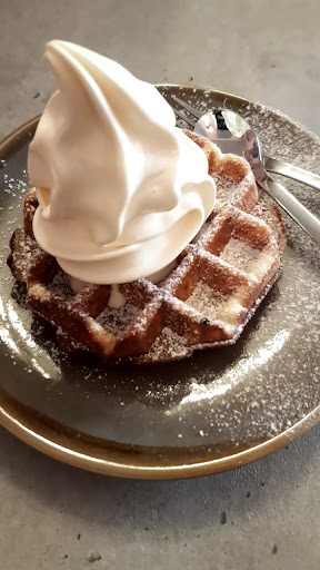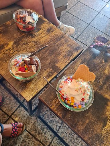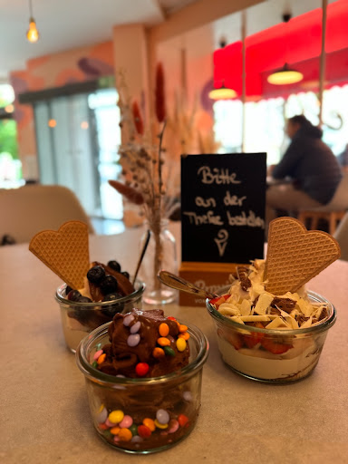 Ein kleines Café wo man drinnen und draußen sitzen kann. Zum Essen: Am Tag gibt es dort 3-4 Eissorten von denen mindestens eine Vegane dabei ist. Es gibt fruchtige Sorten wie Kirsch, Mango o.a oder Vanille oder mein Favorit : Schoko. Wenn es nicht das Eis da ist welches du möchtest gibt es eine Tiefkühltruhe für "Eis zum mitnehmen" wo du dir ein Eis deiner Wahl aussuchen kannst (meist sind ae Sorten die der Laden hat in der Truhe). Die Toppings sind vielfältig und lecker. Es gibt fruchtige toppings wie Erdbeeren, knusprige wie Kekse, schoki, Streusel, Nüsse, granola usw. Und auch Soßen (auch hier sind viele toppings auch vegan). Das Eis vom Geschmack ist eine 8-10/10. Es gibt aber nicht NICHT NUR EIS sondern auch (nicht immer) Waffeln, cupcakes und Kuchen. Zu den Mitarbeitern: Sehr freundlich. Die Mitarbeiter sind geduldig, hilfsbereit und sehr nett. Auch wenn sie lange in dem Café stehen haben sie immer ein Lächeln da. Zum Ambiente: Man kann draußen so wie drinnen sitzen. Die Tische sind ordentlich abgewischt und es gibt Stühle und "banksofas". Die Deko ist sehr schön und man fühlt sich wohl. Für meinen Geschmack sieht es irgendwie etwas kahl aus... Aber es ist schön dort. Auch ein WC hat das Café. Zu den Preisen: Ich persönlich finde es sehr teuer, aber ich gehe auch nicht oft dorthin und wenn ich da bin ist es mir den Preis immer wert. Andere Menschen finden den Preis sicher "angemessen" :) aber mir ist es zu teuer. An sich finde ich der Laden hat ein Besuch verdient. Also ich empfehle ihn mit Freude weiter! Aber Achtung: meist ist er am Wochenende SEHR stark besucht. P.s. Das Eis...