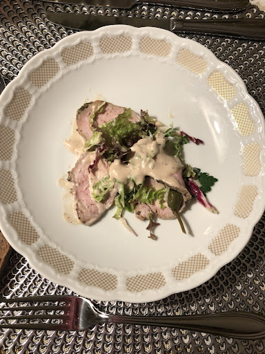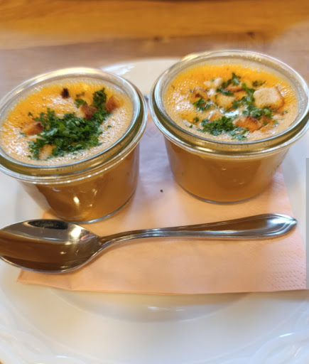 Essen war phantastisch. Die Karte für 2 Wochen ist klein in Form eines schmalen länglichen Zettels mit 2 Vorspeisen, 5 Hauptgerichten (je einmal Geflügel, Rind, Schwein, Fisch, Risotto und Hinweis auf die Dessertkarte. Kann alles im Internet angesehen werden. Vorweg gab es einen leckeren Gruß aus der Küche in Form eines kleinen Wirsingschaumsüppchens im Mini- Weckglas und einem kleinen Croustini mit Pilzpesto auf dem Deckel. Danach einen knackigen Blattsalat mit Radieschenscheiben und würzigem Dressing. Als Hauptgang ließen unsere Steaks vom STEAK VOM IBERICO SCHWEINERÜCKEN und das RUMPSTEAK VOM GRILL absolut keine Wünsche offen. Gemäß Wunsch perfekt auf den Punkt gegrillt und das Iberico klasse gewürzt. Als Beilage gab es u.a. jeweils eine große Portion Pommes Frites.