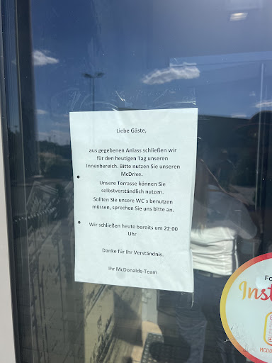 Beim 2. „Besuchsversuch“, 2 Wochen später war aus „gegebenem Anlass“ der Innenbereich komplett geschlossen, was auch immer der Anlass sein sollte, vertretbar wäre wenn dann der Mc Drive wenigstens funktioniert. Da aufgrund unserer Gespannlänge der Mc Drive nicht möglich war, sind wir zu Fuß am bestellschalter gestanden. Mit einigen anderen Reisenden, dort stand dann das nur Barzahlung möglich sei, wenn man mit Karte zahlen will, bitte drinnen bestellen.