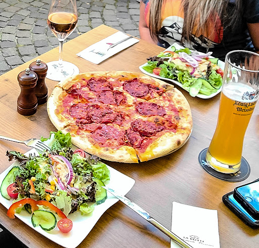This is our FAVORITE place for pizza and dessert. Pasta Gorgonzola was a bit thin for us so we stick to the Pizza Calabrese (salami piccante and dollops of delicious n'duja) and chocolate soufflé (like a lava cake). Great Hefeweizen and nice dry Rosé also. You need reservations for Friday and Saturday evening, but otherwise we always get a table. Very kind staff and prices are quite fair. It is an easy bike ride from Clay kaserne through the fields and into town. Thanks for many great date...