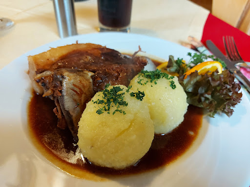Ich würde ja gerne noch mindestens 3 weitere Sterne dazugeben. Also Leute, das war wieder ein Toperlebnis: Gaststätte wirkt gediegen und sauber, die Wirtin war gut drauf und zu Scherzen aufgelegt. Dann das Essen, or nee! Nun esse ich ja sowieso gern (!wer nicht geniest ist ungenießbar!), also wählte ich Hirschbraten und meine Frau das Beefsteak. Zur Speise gehörte eine Vorsuppe (Rinderkraftbrühe mit Leberknödelspätzle und Gemüseschnipseln). Dann kam mein Hirschbraten mit Hofer Klößen (diese ähnelten zu 99% den echten Thüringer Klößen, also fühlste dich wie daheim). Dazu für mich ein gepflegtes Quell (Bier bis zum Eichstrich und eine ordentliche Schaumkrone drauf). Dann wollte ich zahlen, sagte sie Wirtin :"Erst wenn Sie das Dessert verspeist haben". Meine Frau ein Espresso und ich wg. der Diät ein Eis. In Summe 30,20€. Da gibste gerne Trinkgeld. Also solchermaßen gestärkt traten wir die Heimfahrt an. Wenn nix dazwischen kommt, dann besuchen wir diese hübsche Restauration im nächsten Jahr wieder. Ihr Wirtsleute haltet durch und bleibt gesund! Und Ihr, die das gelesen habt, kehrt dort ein! Bis...