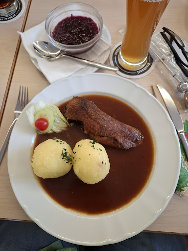 Zuerst war ich überrascht wie gut der Landgasthof insgesamt besucht war. Es waren dort mittags viele Personen anwesend (die nicht zur Weihnachtsfeier gehörten). Es erwartet einen ein modernes gepflegtes Ambiente. Hier kann man auf jeden Fall aufgrund der Größe des Landgasthofes auch größere Feierlichkeiten ausrichten und es sind genügend Parkplätze vorhanden. Das Essen war wirklich hervorragend. Für die Weihnachtsfeier konnte man im Vorfeld aus Gerichten wie Gansbrust, Zanderfilet, Rehbraten, Rumpsteak, Kalbsbraten oder Gemüseschnitzel wählen. Es sah alles sehr ansprechend aus und die Gansbrust mit Klößen und Rotkraut war wirklich hervorragend. Als Nachspeise gab es Apfelküchlein mit Vanillesauce. Die Nachspeise war ebenfalls exzellent. Und wo man woanders merkt das Klöße nicht selbst gemacht sind oder eine Vanillesauce als Fertigprodukt einem Gast vorgesetzt wird, merkt man hier das die Klöße selbst gemacht sind und die Vanillesauce hatte eine Farbe, Konsistenz und einen sehr guten Geschmack den man bei Fertigprodukten so nie erreichen kann.