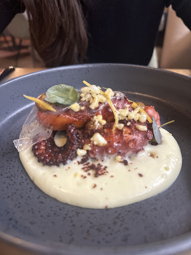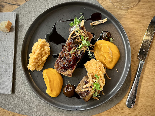 Read moreWir waren zu zweit auf eine Empfehlung an einem Freitag im Mai 24' /20 Uhr dort spontan eingekehrt. Es war waren 14 Personen dort und noch Tische frei. Das Personal ist sehr freundlich und der grosse Hund im Eingangsbereich nicht jedem seine Sache. Das Ambiente ist dunkel und sehr schlicht. Im hinteren Bereich kann man in die offene Küche schauen. Sehr schön mit einem besonderen Flair. Die zwei Bedienungen erzählten einem was auf dem Teller ist, den man gerade bekommt. Die Weine sind sehr hochpreisig, was keinen wirklich stört, da das Essen ja etwas besonderes ist. Die Deko und die Art der Präsentation ist sehr gut. Schönes Geschirr zu jeder Speise im Wechsel andere Teller oder Schalen. Wir wählten ein 7 Gänge Überraschungsmenü ohne Weinbegleitung, die separat dazu geordert werden kann. Wir hatten eine Flasche Lugana für 55 Euro, der ganz gut ist. Ein späteres Glas Rotwein dotierte 12 Euro, schmeckte aber sehr gut. Der Gruß aus dem Haus war eine Miniatur und schön anzusehen. Wir waren leider nicht von der Qualität der Speisen und deren Zubereitung positiv überrascht. Die Menge war ok und wird auch nicht bemängelt. Geschmacklich war z.B. der Adlerfisch gut, für den ich 4 Sterne gebe. Aber z.B. der Tintenfisch war angebrannt und obwohl ich es bei der Bedienung und auch später bei dem Chef (nehme ich an) bemängelte, kam keine Entschuldigung oder ähnliches. Es wurde ignoriert. Die weiteren Gänge sahen immer sehr schön aus, aber überzeugten nicht durch Geschmack oder einem guten Geruch. Unsere Nebentische überschütteten die Bedienungen mit Lob über das grandiose Essen, aber leider können wir uns da nicht anschließen. Selbst das Brot ist nicht besonderes. Wir haben es getestet und werden auf Grund unserer Eindrücke, keine Empfehlung aussprechen. Hier ist noch viel Luft Bach oben. Viel Erfolg und ich hoffe das an den Speisen noch an der Qualität...