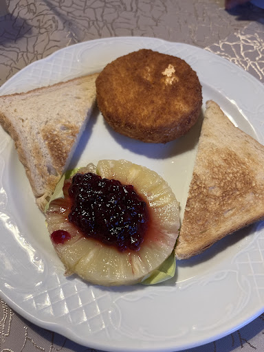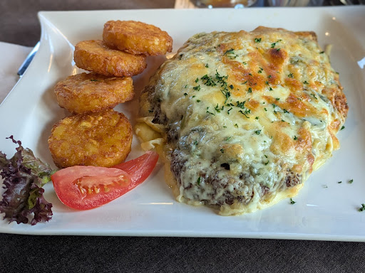 Baked Camembert was cold inside. French fries were way too much covered in spices. Salat bar was very simple. The only frisch was salat. Other vegetables were canned. I am also not the fan of salat bar because of hygiene. Service was nice, I could go inside with the dog. Only after asking for French fries without spices the nice part changed and was caricatured nice. Schnitzel was ok. Price was low. Toilet was surprising...