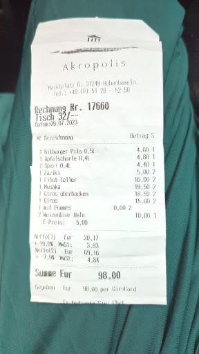 Es handelt sich um ein alt eingesessenes griechisches Restaurant im Kern von Hohenhameln. Das Restaurant ist bobust eingerichtet und wirkt auf mich ein bisschen in die Jahre gekommen. Es gibt wohl auch einen Saal für Feiern. Einige wenige Parkplätze direkt am Restaurant. Weitere in der Nähe zum Beispiel bei der Sparkasse gegenüber. Ich war dort schon viele Jahrzehnte Gast und bis dato auch Recht zufrieden. Wir haben uns am 22.06.24 spontan dazu entschlossen etwas Essen zum Mitnehmen zu bestellen. Die Bedienung / der Chef waren sehr höflich und haben unsere Bestellung mit Sonderwünschen aufgenommen. Es wurde mir ein Uso für die Wartezeit angeboten welchen ich abgelehnt habe und nach einer kleinen Cola stattdessen gefragt habe. Mir wurde dann eine große Cola vor die Nase gestellt die ich dann hinterher mit 4,80 € bezahlt habe.Das Essen wurde schnell zubereitet und wurde "großzügig" verpackt und in einer großen Tüte mitgegeben. Ich habe 59,80€ bezahlt ( inkl. der Cola) was mir schon ein bisschen viel für zwei Personen vorkam. Da es aber bisher immer große Portionen gab habe ich das so akzeptiert. Soweit so gut. Zuhause angekommen musste ich erschreckend feststellen dass die Portionen für den Preis und mein Empfinden sehr klein waren. Bilder im Anhang. So zum Beispiel ein Bifteki überbacken mit Reis ( Käse 3,50€ extra) insgesamt mit Käse für 22,50€. Ein Suvlaki für 17€. Eine Portion Zarziki für 6€ und eine kleine Portion Schafskäse für 9,50€ !!! Leider wirkten die Produkte entgegen meiner Erfahrung nicht wirklich hochwertig sondern sehr nach Convinience Produkten. Das Bifteki und das Suflaki waren soweit okay. Der Reis hat für uns beide ein bisschen seltsam/seifig geschmeckt. Der Zarziki war leider nichts besonderes und schmeckte wie ein Zarziki von Apostel (max. 3 Euro) und der Feta Käse ( sehr trocken) den man im Laden für ca. 2€ kaufen kann war für uns schon lächerlich überteuert. Ich weiß und verstehe das ein Restaurant auch Kosten und Ausgaben hat und noch Geld verdienen muss. Leider stimmt hier das Preis/ Leistungs / und Qualitäts Verhältnis für uns nicht mehr. Ein vergleichbares Essen haben wir an anderer Stelle deutlich günstiger bekommen. Auf meine telefonische Nachfrage habe ich vom Chef nur zur Antwort bekommen das alles teurer geworden ist und das das Essen so ist wie es ist. Keine Entschuldigung oder Nachfrage warum und wieso. Fazit: Leider für mein Verständnis qualitativ nicht dem Preis angemessen. Zu hohe Preise. Für uns war es leider seit Jahrzehnten der letzte Besuch. Erst Recht wenn den Beanstandungen von langjährigen Kunden so wenig Bedeutung...