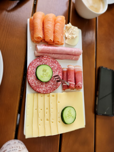 Wir kamen Sonntags gegen 11, nur wenige Plätze waren draussen noch frei. Überall wurde gefrühstückt, Lachs, Rührei, Brötchen Käse...alles im Überfluss und vieles blieb zum Schluss liegen....aber wir durften nicht mal ein Brötchen bestellen...weil wir nicht reserviert hatten.