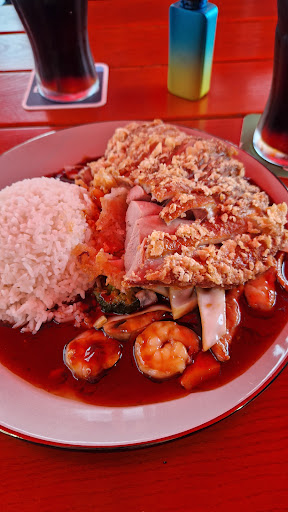 Das Restaurant bietet auf der Promenade sowie im Innenraum Platz für seine Gäste. Das Ambiente ist einfach aber zweckmäßig. Weder Luxus noch modern sind hier anzutreffen. Das Personal war freundlich und aufgeschlossen. Die Speisekarte enthält die üblichen Gerichte der chinesischen Küche.