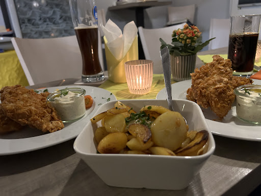 Read moreZweites Abendessen in Husum. Absolut unterschätztes Restaurant am Außenhafen; eher unscheinbar und einfach in der Ausstattung (zum Teil Campingstühle im Garten), aber das Essen ist großartig. Familienbetrieb, von der Küche bis zum Service; Vater und Tochter pflegen einen sehr humorvoll-entspannten Umgang miteinander und den Gästen, wer das als patzig empfindet, ist spießig! Man kann innen auf interessanten Plüschstühlen sitzen oder im leicht verwachsenen Garten, allerdings dann hinter Plexiglaswänden (immer diese Angst vor Meerbriese); wir haben lieber einen der beiden Außentische belegt, beste Sicht übers schöne Hafenbecken, wenn nicht gerade irgendwelche SUV-Kasper sich in den Weg parken. Leider nur König Pilsener vom Fass, ein regionales Bier wäre für Könige. Vorspeise frittiert Krabben. Gibt es sonst eher selten und auch erstmal ungewöhnlich, weil sie komplett mit Schale und Kopf gegessen werden; aber keine Sorge, ist super knusprig und lecker - Fischer-Chips, sozusagen. Weiter ging es mit Fisch. Seelachs in und mit Ei gebraten, tolle Kombination, sowie Backfisch, kross ausgebacken, innen auf den entscheidenden Punkt – klar wird Backfisch frittiert (in Fett, tatsächlich), aber das weiß man, dazu super Bratkartoffeln. Beide Fische sehr frisch, es wird auf Qualität geachtet, und sehr...