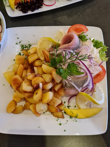 Die Bestellung ging recht schnell, das Personal ist freundlich. Zunächst wurde uns ein nicht bestelltes Getränk gebracht – beim zweiten Versuch hat es dann geklappt. Wir entschieden uns für die Fischplatte mit 3 verschiedenen Fischfilets, Bratkartoffeln, Remoulade und Salat. Leider wurde alles auf einem Teller angerichtet – das Salatdressing (recht wässrig) hat sich somit ausgebreitet und lief unter die Bratkartoffeln und die Filets und hat die Kartoffeln und die Panade aufgeweicht.
