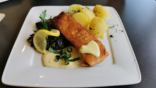 Die 3 Fischfilets waren alle in der gleichen Panade „verpackt“ – wäre in der Speisekarte darauf hingewiesen worden hätte ich darum gebeten die Filets ohne Panade zu erhalten. Mit den Bratkartoffeln hat der Koch ziemlich gespart Es wäre sicherlich möglich gewesen Bratkartoffeln nachzubestellen – wir haben uns dagegen entschieden, da wir wie gesagt auf der zwar verglasten und überdachten Außenterrasse saßen. Der Nachteil an dieser Terrasse ist, dass dort der Eingang für das Restaurant ist und dieser nur durch einen Rollladen verschlossen werden kann, was natürlich während der Öffnungszeiten nicht möglich ist. Bei sehr windigen 14° Grad Außentemperatur wird es dort sehr schnell richtig kalt und wir mussten während des Essens unsere dicken Jacken anbehalten, wie auch die anderen Gäste, die teilweise in Daunenjacken am Tisch saßen. Leider wurden die Heizstrahler, die reichlich vorhanden sind, nicht eingeschaltet. So war der Abend recht kurz und frisch – Bestellen, Essen, Bezahlen und wieder ab nach Hause um sich aufzuwärmen.