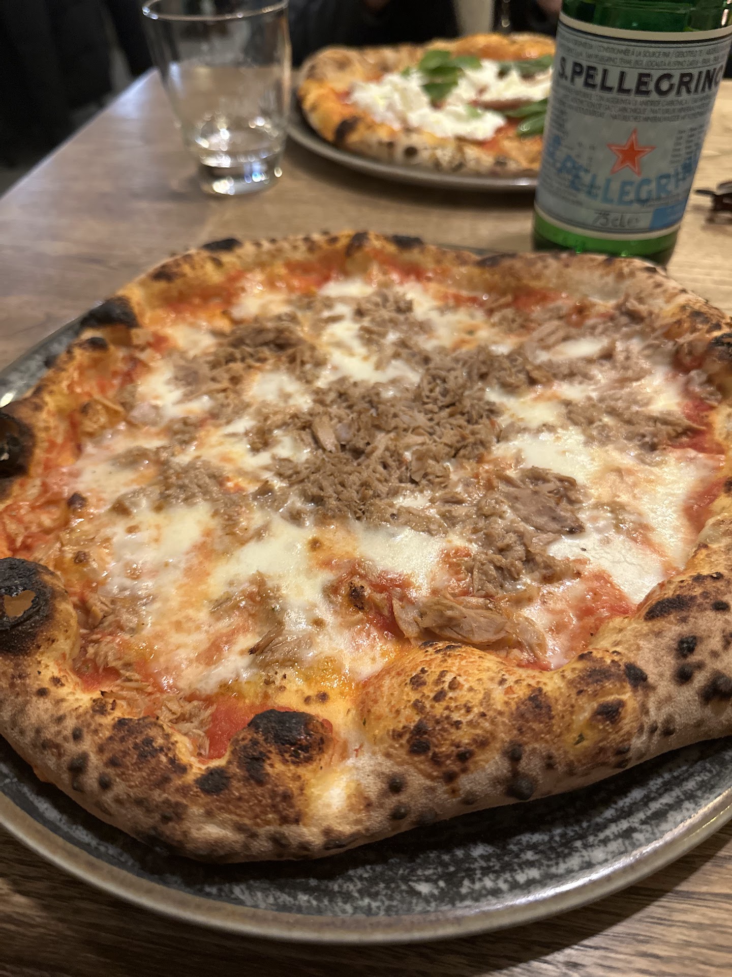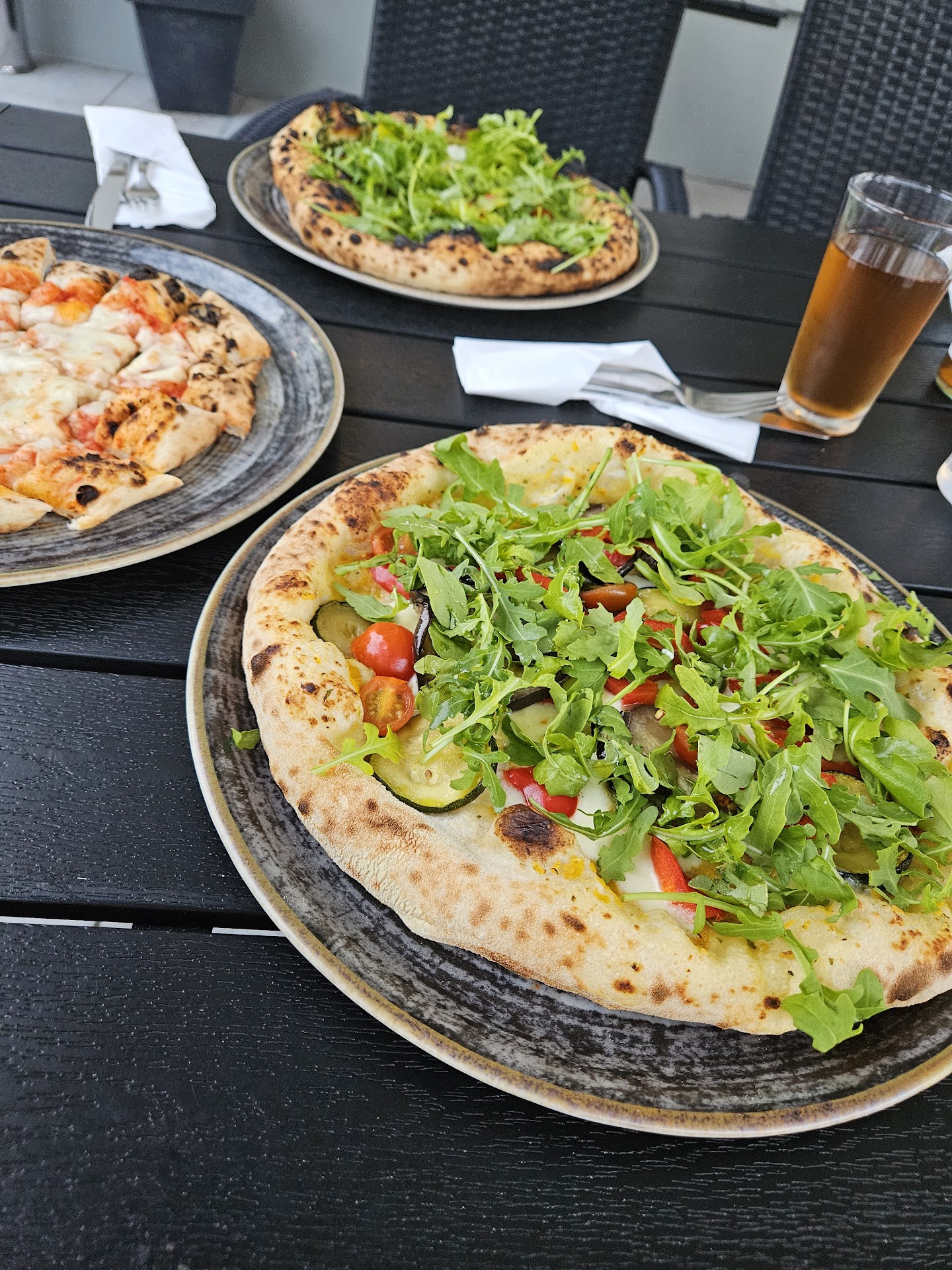 2 Pizza und einen Salat vor Ort bestellt , war schnell fertig und zuhause auch noch warm. Preis war in Ordnung. Wer zur napoleonischen Pizzaria geht weiß auch was er bekommt , erkennt man bei vielen Kommentaren , das sie einfach keine Ahnung haben. Vermutlich können die 1 Sterne Bewertungen nicht mal mit 450 grad oder 90sekunden etwas anfangen. Deswegen sollte jedem klar sein , das er einen hellen Rand bekommt. Teig war lecker und nicht zu laff, nicht verbannt. Man merkt an der Pizza das der Bäcker sein Handwerk versteht. Zuschauen kann man auch , super. Optik der Pizza auch mega. So kommen wir zu den Punkten wo es verbesserungsfähig ist.