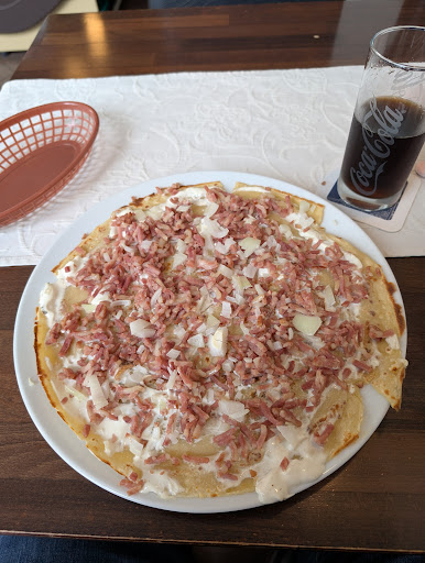 Read moreDas Idarer Pfannkuchenhäuschen ist ein schöner Ort, um ein preiswertes und kleines Mittagessen zu sich zu nehmen. Wir kehrten zu viert ein und standen etwas unter Druck, unseren Beginn der Führung durch die Edelsteinmine nicht zu verpassen. Wir aßen 2 x Pfannkuchen mit Schinken, 1 x l mit Champignons und 1 x mit Apfelmus. Alle Gerichte waren lecker und frisch in der Pfanne zubereitet und im Ofen mit Käse überbacken. Anbieten...