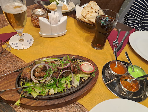 Als Appetizer wurden Papadams & drei verschiedene Chutneys serviert. Das erraten & heraus schmecken der Zutaten und Gewürze ist spannend & macht Lust auf mehr. Das rote Chutney mit Salzzitronen ist sehr zu empfehlen aber Vorsicht, scharf! Zum Hauptgang bestellte ich Lamm Tikka aus dem Tandoori Ofen. Zu allen Tandoori Gerichten wird standardmäßig Naan-Brot (plain), als Beilage gereicht. Außerdem bestellte ich Paneer Kulcha, ein Naan gefüllt mit hausgemachtem Käse (erinnert an Ei). Ob der Käse "nur" hausgemacht oder vllt . sogar von der Dame des Hauses selbstgemacht ist, weiß ich (noch) nicht. Das Lamm wurde eindrucksvoll, in einer zischend heißen Gusschale serviert & sah vielversprechend aus. Zu meinem Bedauern musste ich leider feststellen, dass das Lamm zu lange gegrillt wurde & damit ziemlich trocken war. Der dazu bestellte Raita (Joghurt mit Koriander...) wurde mit frischem Gemüse & Kräutern zubereitet & war, für mein Lamm, mehr als nötig.