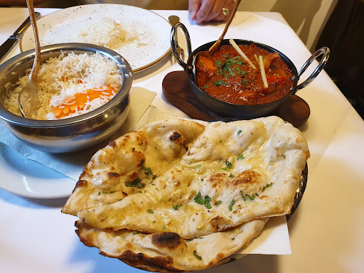 We shared a starter of garlic bread which was freshly cooked and in fact took a while to prepare, then 3 main dishes, a chicken mango, chicken butter and the classic chicken tikka masala (all served with perfectly cooked basmati rice). Everything was excellent, portions had a perfect size served in small copper pots which maintained the heat throughout.