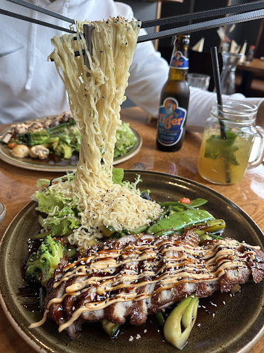 Read moreIch war in diesem asiatischen Restaurant schon mehrfach zur Mittagszeit während der Woche. Parkplätze findet man im Umfeld an der Straße oder in den Nebenstraßen. Das Restaurant befindet sich unscheinbar an der Hauptstraße. Die Straße selbst nimmt man, auch auf der Fläche zur Außenbewirtung, nicht wahr. Die Gaststätte und die Außenfläche sind barrierefrei zugänglich, bei der Eingangstür ist ggf. Unterstützung erforderlich. Der Gastraum ist angenehm gestaltet und sauber. Wenn wir das Restaurant in Gruppen (ca. 6 bis 8 Personen) besuchten, hatten wir vorher reserviert, eine Reservierung war meines Erachtens in der Mittagszeit stets nicht erforderlich. Es gab zwar auch mal die eine oder andere Besuchergruppe, Plätze waren aber ausreichend vorhanden. Die Servicekräfte waren stets freundlich und fragten zurückhaltend und unaufdringlich lieber freundlich einmal zuviel als zu wenig, ob man noch was möchte oder alles gut ist. Als Besteck werden sowohl Stäbchen als auch Löffel, Gabel und Messer gereicht. Die Speisekarte ist recht umfangreich (Vorspeisen, Currys, Nudeln, Sushi) und es gibt öfters zahlreiche Variationen mit Tofu, Ente, Hähnchen, Rind, Fisch oder Garnelen. Es sollte jeder etwas für seinen Geschmack finden können. Es gibt verschiedene Highlights wie die "Flying Noodles". Für die Mittagszeit (12.00 bis 15.00 Uhr) gibt es die Auswahl mehrerer Mittagslunchs, auf Wunsch ergänzt um eine hausgemachte Limo sowie zum Abschluss Kaffee (normal oder Espresso) oder Tee. Auf den Bildern sieht man als Getränk: Ingwer Limonade als Vorspeise: "Rolle im Sommer" Reispapierrollen, gefüllt mit Wildkräutersalat, Gurke, Reisnudeln dazu Limetten-Fischsoßen-Dressing und Erdnüsse als Hauptspeise (Mittagslunch): "Bento 2" Hähnchen im Tempuramantel mit Curry Erdnuss Sauce & Sesamreis + 8 St. maki & Salat der Saison Die Speisen schmecken, subjektiv betrachtet, sehr gut und stehen in einem angemessenen Preis-Leistungsverhältnis. Meine Kollegen, Freunde und ich kommen...