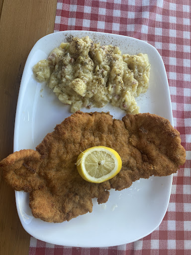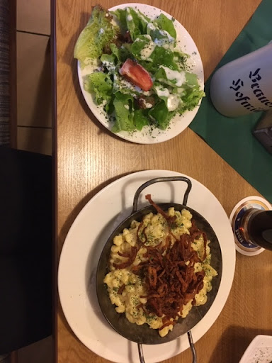 Read moreIm Gastgarten mag es bei schönem Wetter sicher angenehm sein. Drinnen ist es durch die Glühbirnen mit gelbem Licht extrem duster, ich hatte wirklich Mühe, die Speisekarte zu lesen. Bestellt hatte ich Käsespätzle, dachte, grad in Bayern kann man da nix falsch machen. Leider weit gefehlt, ich hab tatsächlich noch nie so schlechte Käsespätzle gegessen - sie wurden mit Cheddar-Käse (!) zubereitet und mit Pizzakräutermischung (!) gewürzt. Entweder sind der Küche die richtigen Zutaten ausgegangen oder der Koch hat keine Ahnung. Ich bin ja eher nachsichtig, aber da ist mir so einiges entgleist (und denen, die gekostet hatten ebenfalls). Da ich eingeladen war, wollte ich nichts sagen. Wäre ich allein dort gewesen, hätte ich es zurückgehen lassen und wäre woanders...