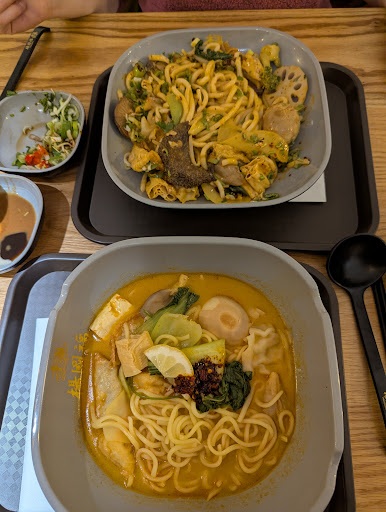 Best place for non vegetarians but tricky for vegetarians. I am a vegetarian and my wife is non vegetarian. This is a special place where you take a bowl and take the ingredients ( mushrooms, celery, broccoli, chicken, beef pieces, verity of noodles whatever you want , and give it to the counter , choose your soup and pay as per the weight. They cook it for you in front of you! That's truly amazing as you have ingredients only you love. But the tricky part is that vegetarian is you don't! you might end up getting some meat pieces from the soup you selected. Also the soup has a strong meaty aroma so for vegetarians it will be a challenge. I don't know if they have vegetarian soups but I have to check next time and update this review. Also they don't have forks, they only have chop sticks and big spoons. Other than that, the service was top notch, One person even helped us when we were clueless on how to order during our first time and the ambience is also the best.!! We...