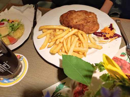 Wir wollten das Gasthaus ausprobieren weil wir nach einem deutschen Restaurant gesucht hatten. Parkplätze vor Ort vorhanden aber gleich am Eingang wurden wir abgefangen und gefragt ob wir reserviert haben? Leider nein und es war so ausgebucht dass wir es am nächsten Tag mit Reservierung wieder probieren wollten. Das hat auch geklappt. Die Frage wurde dennoch jeden neu eintreffenden Gast gestellt und viele mussten wieder gehen wenn Sie sich nicht auf ein Zeitfenster einliesen oder zu viele waren. Spricht ja im Grunde schon Mal für sich vor allem da es reichlich Auswahl an Gaststätten in der Umgebung gibt.. Die Kellnerin im Dirndl brachte uns gleich die Karte war freundlich und hatte Humor. Getränke und Essen kamen schnell und das Essen war sehr gut und reichlich. Ja beim Preis waren wir erst Mal etwas geschockt aber andererseits, wo bekommt man unter 17€ noch ein Essen? Es ist ja Urlaub und von der Menge und vor allem Geschmack war der Preis angemessen. Zudem es gab auch eine Kinderkarte wenn jemand kleinere Kinder oder Hunger hat und da war es auch günstiger. Von der Auswahl her: Tageskarte mit Braten, Fisch, Dessert, Vegetarisch. Reguläre Karte mit weiteren Pfannen und Bratengerichten, Vegetarisch, Fisch, Dessert, Kinderkarte... Wir bestellten: Cordon Bleu, Hackbraten mit Pilzsauce, Schweizer Wurstsalat (hier war etwas wenig Käse vorhanden) mit Salat und viel Wurst. Zum Abschluss gönnte ich mir noch einen Tropfenstrudel = exquisite! Der Kellner der zwischendrin das Essen brachte hatte zwar keine Tracht sondern Jogginghose aber das machte es ländlich authentisch da mein Wirt im Dorf auch trägt wonach ihm gerade ist. Also geht hin, unterstützt die Gaststätte und lasst es euch schmecken. Wir können es...