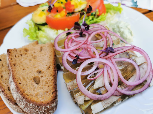 Read moreIn einem alten, schön renovierten Gebäude einzukehren macht immer wieder Spaß. Der Innenhof war gemütlich, ein klein wenig zu weitläufig, sodass die Gäste ein bisschen zu weit auseinander saßen. Das könnte man durchaus ändern. Die Deko und die Pflanzenkübel waren sehr schön. Das Essen und die Getränke wurden schnell serviert. Das von mir gewählte vegetarische und kalorienarm bezeichnete Gericht (Gemüse auf Weißbrot überbacken) war geschmacklich gut, aber leider unter einer zu dicken Käseschicht begraben. Feine Küche könnte hier, nicht wegen der Kalorien, aber wegen des Geschmacks sparen. Schön war der Gastraum im Inneren und besonders lobenswert und herausragend der Aufzug für gehbehinderte Menschen. So konnte vom Innenhof problemlos der Gastraum oben und die Toiletten im Keller erreicht werden. Das gibt es so selten, dass es dafür meinerseits die fünf...