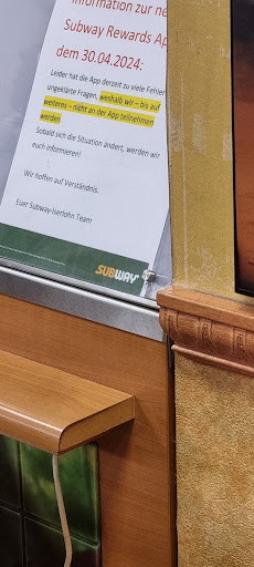 Read moreEdit: Leider muss ich im Nachhinein Sterne abziehen. Personal: Leider sind die jungen Damen nicht sehr kompetent in Sandwiches Belegen. Wenn diese im Dienst sind, weiß ich direkt, die Subs werden nicht gut belegt. Zum einen liegt es daran, dass sie wirklich seeeeeeehr sparsam mit den Zutaten umgehen. Geriebener Käse und andere Streuzutaten sind kaum der Rede wert und man muss um mehr bitten, wenn man mehr als 5-6 Maiskörner haben möchte und nicht nur eine Priese Käse. Des Weiteren besteht nicht die Regel, dass auf ein halbes Sub 2 Scheiben Gouda gehören und auf ein ganzes Sub 4? Die jungen Damen legen schon mal gerne auf ein halbes Sub nur eine Scheibe Käse, habe mich schon gefragt, ob auf ein ganzes dann nur 2 drauf kommen? Das ist doch nicht die Regel. Auch gehören normalerweise 3 Scheiben Tomaten/Gurken auf ein halbes und Doppelt so viel auf ein ganzes Sub! So kennt man es seit Jahren. Es ist nicht gerade angenehm, wenn man als Kunde jeden Schritt der Mitarbeiterin kommentieren muss. Zudem da die Damen selbst zum Teil auch so leise reden, dass man sie kaum versteht!! Wenn dann doch mal 6 Scheiben Gurken auf ein ganzes Sub ihren Weg finden und dann doch eine wieder runterfällt wird die Scheibe auch nicht nachgelegt. Ich kritisiere nicht, dass man z.B. auch nicht so toll verpackte Subs bekommt, dazu gehört schon etwas Übung, machen die älteren Kolleginnen besser. ABER ich kritisiere, dass die jüngeren Damen scheinbar auch nicht vorausschauend Handeln: ist ein Sub in der ersten Station belegt und könnte schon mal in den Ofen wird dies der Kollegin an der Salattheke überlassen, die dort ihre Arbeit bei anderen Kunden unterbrechen muss. Die Dame an der ersten Station geht dann unerklärlicher Weise einfach in die Küche (wo schon eine andere Mitarbeiterin ist) oder an die Kasse und wartet dort seelenruhig, bis ihre Kollegin fertig ist, andere Kunden warten aber schon an der Schlange an Station 1. ………………… Personal ist immer sehr nett und freundlich, kennt sich mit den Zutaten aus. Haben immer zum Mitnehmen dort geholt. Auf Wünsche wird ohne Murren eingegangen. Von der Sauberkeit her im Essbereich kommt es drauf an, wann man kommt. Ist viel los ist auch weniger Zeit dort mal die Krümel zu entfernen. Die Einrichtung ist etwas in die Jahre gekommen, ansonsten sieht dieser Subway aus wie...