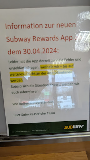 Ich war heute das erste Mal bei Subway und somit auch erstmals in diesem Geschäft in Iserlohn. Zunächst: Das bestellte Baguette hat mir gut geschmeckt. Das ist also schonmal gut.