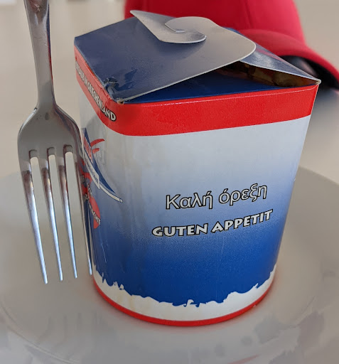 Nach dem Desaster mit der zu teuer berechneten Coke im Oktober 2019 gaben wir dem Laden nun eine neue Chance. Zwei kleine Gyrosteller und eine kleine Portion Pommes, ohne Getränke diesmal, sollten es sein. Dafür waren rund 16 Euro fällig. Das "zufällig" vergessene Wechselgeld ließen wir mal in der Schale auf der Theke liegen.
