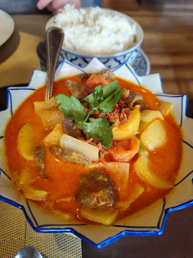Das Curry wurde sehr dekorativ in einer schönen Schale ĂŒber einer Kerze serviert. Es war nicht zu scharf und sehr angenehm erfrischend durch das GemĂŒse und die Kokosmilch. Das Lammfleisch war sehr zart und geschmacksintensiv.