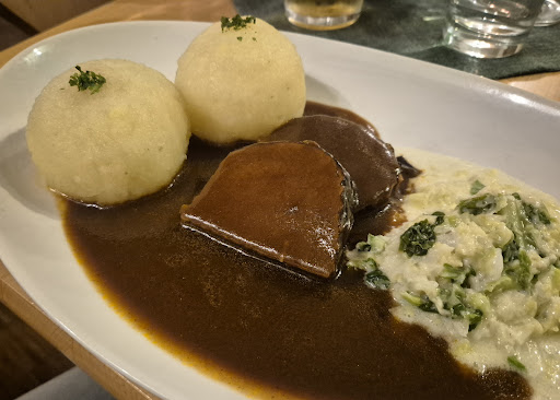 Etwas Positiv: Das Essen (Wildschweinbraten) war im Großen und Ganzen gut. Das Fleisch war zart, die Soße hat etwas enttäuscht, da wir uns anhand der Beschreibung eine sehr dunkle, kräftige Soße erhofft hatten und es leider doch nur eine Standard-Soße war, die sich nicht abhebte. Die Waldpilz-Knödel waren geschmacklich auch ok.