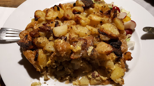 Was it good? •The salads were fresh and had a good variety of leaves and vegetables. •The Brussel sprouts and potatoes were overboiled to tastelessness, mushy and missing ingredients from the menu. Where were you Quark? •The Schnitzel was very very dry. The mushrooms on top were undercooked and missing any kind of herb or spice and even salt seemed to be absent. •The Rostbraetchen was acceptable but not very typical for Thuringia and way below any streetside vendor's Rostbraetl's taste. It seemed to have less than half the juicyness but was still miles above the Schnitzel in that regard. The onions on top were undercooked chewy and were missing salt. •The Grützwurst and Sauerkraut were good. Only the accompanying boiled potatoes were tasting bitter, similar to green potatoes. (which shouldn't be eaten btw.) •Tea, apple juice and beer were good.