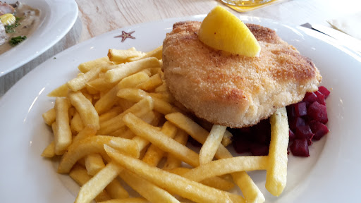 Read moreWir waren letzte Woche auf Juist und es war ein wunderschöner Urlaub , leider haben wir einen Stop in der Strandhalle gemacht um Mittag zu essen . Dies stellte sich leider als sehr schlechte Idee heraus da das Essen absolut minderwertig war und überhaupt nicht seinem Ruf gerecht wurde den sich das Restaurant mal erarbeitet hatte. Wir hatten : Räucherlachs an Rösti mit Salat und einmal Currywurst mit Bratkartoffeln , also wirklich nichts wirklich anspruchsvolles ... Leider war die Küche trotz fast leeren Restaurants völlig mit der Zubereitung überfordert denn die Bratkartoffeln waren matschig und schwammen im eigenen Öl , die Wurst war wenn man es gut meint maximal Handwarm und somit kaum genießbar . Als wir dann dem Kellner bescheid sagten und das Essen reklamierten meinte er völlig eingeschnappt und trotzig ” ich kann Ihnen auch Pommes servieren ”...... Ohne zu fragen ob wir dies überhaupt wollten ....und verschwand in der Küche. Kommen wir nun zu meinem Gericht , ich hatte wie oben angemerkt Lachs mit Rösti und Salat . Machen wir es kurz und knapp , die Rösti sind nicht frisch gemacht so wie es in anderen Restaurants auf der Insel Standart ist sondern Tiefkühlware aus der Tüte ( alle schön Rund , gleich hoch und völlig identisch ) .. Der Lachs und der Salat waren dafür dann relativ in Ordnung was das ganze aber nicht wirklich besser machte. Meine Empfehlung ist daher also ganz klar , wer lecker und gut essen möchte ist dort völlig falsch , mein Fazit ist : Schlechte Qualität , schlechter und unfreundlicher Service für sehr hohe Preise. 41€ ist einfach recht viel Geld für diese 2 sehr simplen Gerichte und 2...
