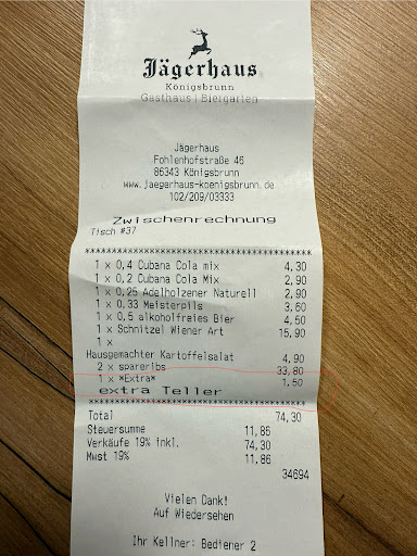 Read moreWir gingen sehr gern zur Resis Jägerhaus und auch danach sehr gern zum neuen Pächter der das Restaurant schön renoviert hat. Nun gehört es anscheinend dem Neffen oder so und mussten leider feststellen es ist nicht mehr das Jägerhaus wo man sich gut aufgehoben fühlt. Bedienung war leicht überfordert mit paar Tischen. Essen kam sehr versetzt, meine Frau hatte ihr Essen erst 15min später kam das meiner Kinder und mir. Das Essen war schön angerichtet aber auch sehr fad, Schnitzel und Spareribs waren trocken. Aber die Krönung kam erst auf als wir zu den Spareribs einen zusätzlichen leeren Teller haben wollten damit meine Kinder ihr Spareribs separat essen können. Dieser Teller wurde anschließend mit 1,50€ extra verrechnet was mich sehr erstaunt hat, in anderen Lokalen nennt man sie Räuberteller die nicht verrechnet werden.