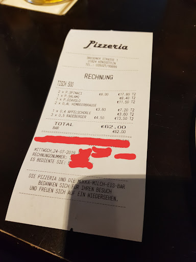 Read moreKeine kartenzahlung, keine Reservierung, Freitag geschlossen, keine Pizza zum mitnehmen, Pizza ab 6,5€, jede Extrawurst 2,50€!!!, 19 Uhr keine Pizza mehr da (ausverkauft), unfreundliche Dame (Inhaberin), kaum Platz ... aber Geld abkassieren, das klappt wie verrückt und nicht gescheit. Schämen sollte man sich, wenn man die Leute, die das Geld bringen, so behandelt. Eigentlich gibts dafür keinen Stern, da die Pizza aber wirklich gut war, gibts den einen Stern. Auf der guten Qualität ruht man sich sicher aus und denkt, man kann die Leute deswegen behandeln wir den letzten Dreck, aber das geht mit Sicherheit irgendwann nach hinten los.