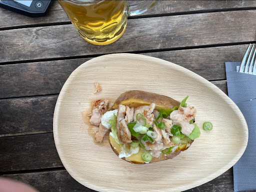 Read moreLeckerer schneller Snack in lockerer Biergarten-Atmosphäre! Man sitzt sehr schön unter Kastanien. Sandkasten für die Kleinen und Fahrrad Parkplatz vorhanden. Wir hatten 2 Burger, 1x Pommes und 1 Back-Kartoffel mit Lachs für rund 50€. Alles lecker und auf abbaubaren Palmenblatt-Tellern serviert. Auf der Karte gibt es nur eine Art Burger, und Pulled Pork mag unsere Große leider nicht. Die Angestellten haben aber schnell improvisiert und einen Chicken Nugget Burger für sie gezaubert. Sehr netter Service mit einem netten Gespräch beim Kommen und beim Gehen. Gut, die Burger könnten ein bisschen größer sein, das rechtfertigt aber nicht die 1Stern Bewertung, die ich hier vorab gelesen habe. Wir sind gastronomisch in einem hochpreisigen Gebiet, da muss man auch bei einer Bude bei drei Personen mit einem gewissen Grundpreis rechnen. Mit Pommes waren alle ausreichend satt und das Bier und Radler aus dem Kühlungsborner Brauhaus vom Fass schmeckt sowieso! Wir waren...