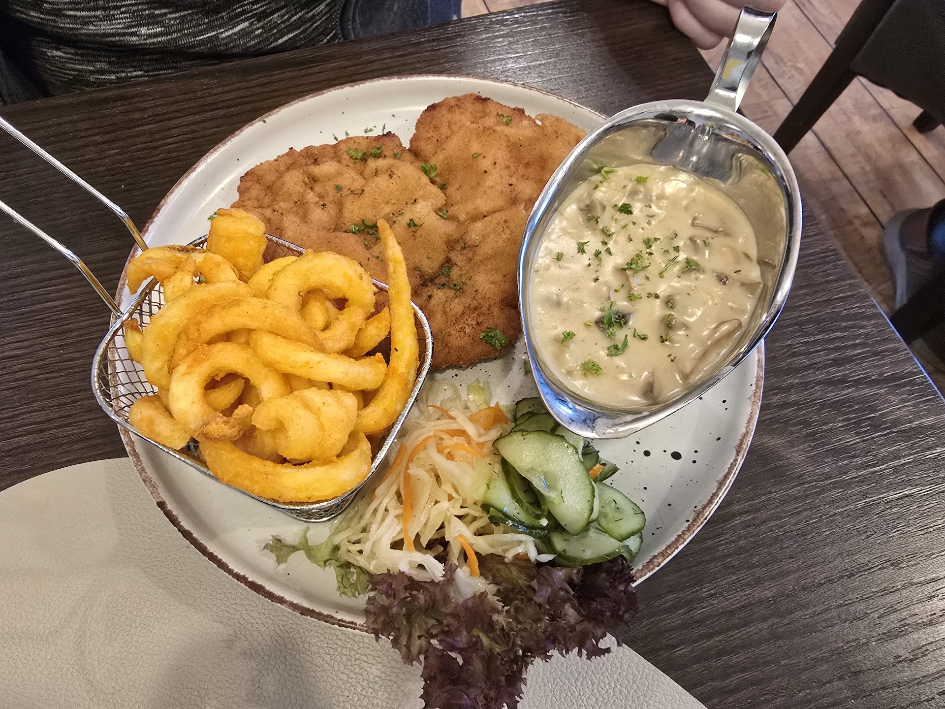 Wenn also Fleisch und Pommes Frites hier also auf den Punkt gegart und darüber hinaus auch noch fein gewürzt waren, so ist das nachvollziehbar immer wieder ein Genuss, wenn ein Gasthaus diese scheinbar einfachen Gerichte perfekt beherrschen. Das Schnitzel war gut bearbeitet, fein paniert und goldgelb. Die Pommes Frites waren weich, aber leicht knusprig, geradezu ein Genuss. Die Soße nach ungarischer Art schmeckte sehr lecker und war offensichtlich selbst gemacht.