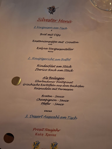 Read moreKurzentschlossen sind wir auf einer Tour durchs Bergische am Ostersonntag im Kalyva eingekehrt. Wir wurden auch ohne vorherige Tischreservierung sehr freundlich empfangen und nach kurzer Nachfrage der netten weiblichen Bedienung wurde uns ein schöner Tisch zugewiesen. Kaum war die Bestellung von der super freundlichen Bedienung aufgenommen, bekamen wir ein Körbchen mit kleinen Pizzabrötchen und Tsatsiki gereicht. Der Weißwein und das frisch gezapfte Kölsch waren auch sehr gut. Wir bestellten einmal die Souvlakispieße mit einer Folienkartoffel und einmal die geschmorte Lammkeule mit griechischen Kartoffeln. Die Spieße waren auf den Punkt gegart und die Folienkartoffel war mit einem Stück Kräuterbutter (wie es aussah, hausgemacht) und natürlich wieder Tsatsiki. Die Kartoffel war von guter Qualität und frisch zubereitet. Die Lammkeule viel etwas klein aus, aber war vom Garpunkt her perfekt - das Fleisch löste sich fast schon selbständig vom Knochen und hat sehr gut geschmeckt, genau wie die dazu gereichte Soße und die griechischen Kartoffeln - die eine Art Kartoffelspalten mit Schale waren. Der Beilagensalat war ebenso frisch und das Dressing hierzu sehr gut. Zum Abschluss gab es noch einen Espresso für meine Frau und einen Ouzo für mich aufs Haus ! Das nenn ich wirkliche Gastfreundschaft ! Fazit : Ein tolles Lokal mit schönem Ambiente, mit sehr zuvorkommender und sehr freundlicher Bedienung - was ja heutzutage leider kaum noch anzutreffen ist !! Wir wurden auch ohne Reservierung und trotz vollem Haus, aufgrund des Feiertages, sehr freundlich aufgenommen! Die Speisen sind wirklich super lecker und auch preislich gerechtfertigt und mehr als in Ordnung. (auch wenn die Lammkeule etwas schmächtig ausfiel). Wir waren zum ersten, aber bestimmt nicht zum letzten Mal...