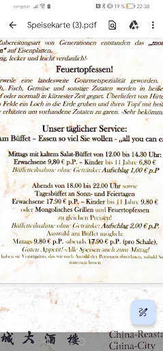 Wir hatten für 4 Personen um 19.30 Uhr heute reserviert. Als wir ankamen, standen wir erst einmal im Eingangsbereich, doch es kam keiner. (und es war nicht viel los!) Von den zurzeit geltenden Coronaregeln mal abgesehen (und ich poche nicht auf Kontrollen!!), haben die paar Leute die hier saßen, sich alle an Mundschutz gehalten, doch dem. Personal schien es egal zu sein, denn die räumten die Tische ohne Mund-Nasen-Schutz ab. Ebenso wie beim bezahlen, war davon nichts zu sehen. Anscheinend gelten für sie andere Regeln. Als wir nach fast 10 min endlich unseren Tisch hatten, saßen wir weitere 10 min bis endlich jemand kam, um unsere Getränke aufzunehmen und weitere 15 min bis wir sie endlich vor uns stehen hatten!!! Nach dem dass erledigt war, sind wir zum Buffet gegangen und waren mehr wie enttäuscht. Bis auf wenige Löffel einiger Gerichte, war so gut wie nichts mehr da. Ab und an wurde mal wieder Nudeln ud Reis aufgefüllt, doch vom Rest war nichts zu sehen. Der mongolische Grill war ebenso ein Witz!! Das Schweinefleisch hatte einen leicht gelblichen Schimmer, von den anderen Fleischsorten waren wenig bis kaum etwas zu sehen. Hummerkrabben waren ausgeschildert, doch auch die waren nirgends zu finden. Selbst Teller waren keine mehr vorhanden. Nachdem die Teller endlich wieder aufgefüllt wurden und wir die Bedienung darauf hinwiesen, dass es eine Frechheit sei, so etwas Buffet zu nennen und dafür auch noch Geld zu verlangen, ließ sie uns kommentarlos stehen und ignorierte uns. Nach einer halben Stunde wurde es uns zu blöd. Wir beschwerten uns beim Chef. Der wiederrum sagte nur es würde aufgefüllt werden, doch passiert ist nichts. Wie verlangten die Rechnung die sage und schreibe 66 Euro machte. (Für 2 Teller Suppe, ein paar Frühlingsrollen, etwas gebratenes Fleisch und 4 Getränke!!) Die Bedienung erließ uns zwar 36 Euro, doch dass macht das ganze nicht besser.
